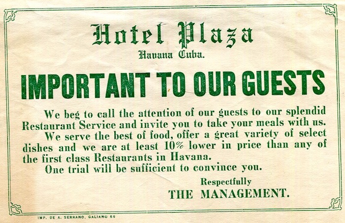 Cuba Havana Hotel Plaza Leaflet 1928