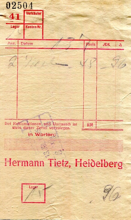 Germany Heidelberg Commerce Hermann Tietz Receipt 1935