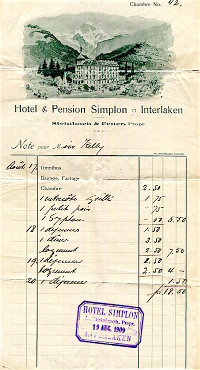 Switzerland Interlaken Hotel & Pension Simplon Receipt 1909