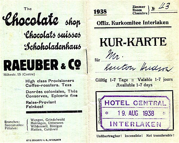 Switzerland Interlaken Hotel Central Kur Karte 1938