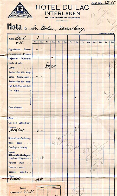 Switzerland Interlaken Hotel Du Lac Receipt 1928