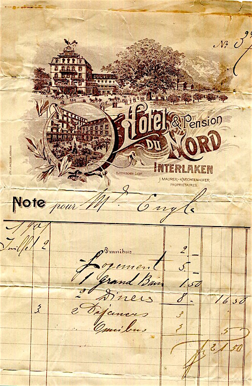 Switzerland Interlaken Hotel Du Nord Receipt 1901