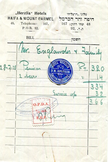 Palestine Jerusalem Hotel Herzlia Receipt 1924