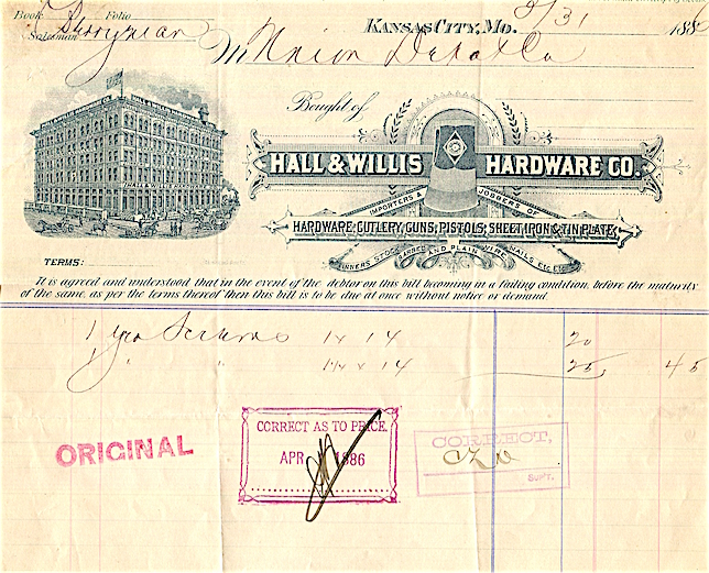 • USA Missouri Kansas City Receipt Commerce Hall Willis Hardware Co 1886