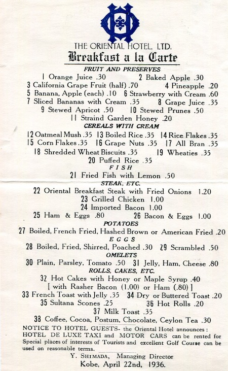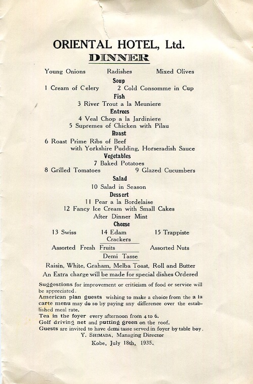 Japan Kobe Menu Oriental Hotel 1936
