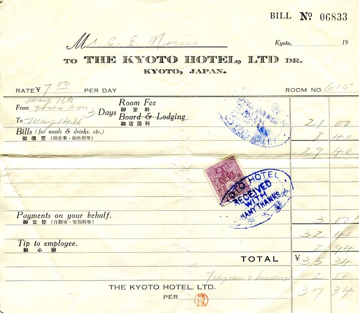 Japan Kyoto Receipt Kyoto Hotel 1937