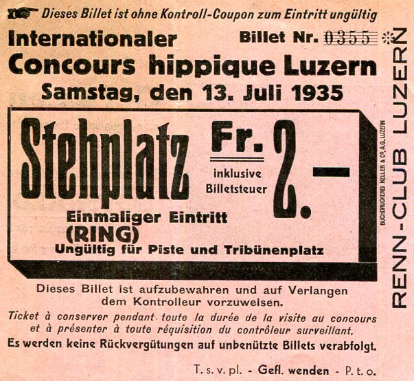 Switzerland Lucerne Entertainment Concours Hippique Ticket 1935