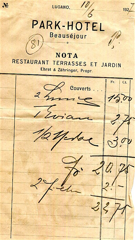 Switzerland Lugano Park Hotel Restaurant Receipt 1927