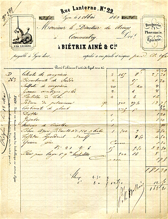 France Lyon Commerce Bietrix Aine Receipt Pharmacist 1865