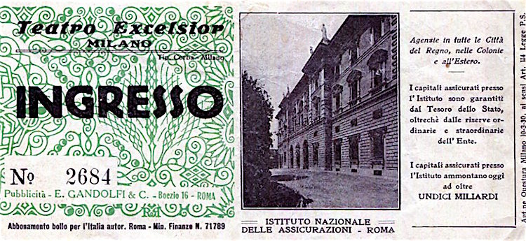 Italy Milan Entertainment Excelsior Theater Ticket 1930