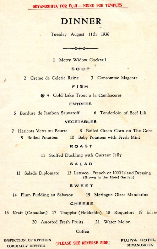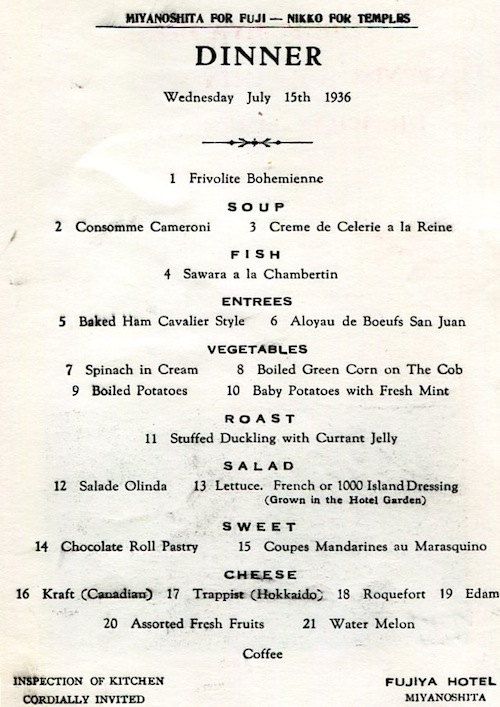 Japan Miyanoshita Menu The Fujiya Hotel 1936-2