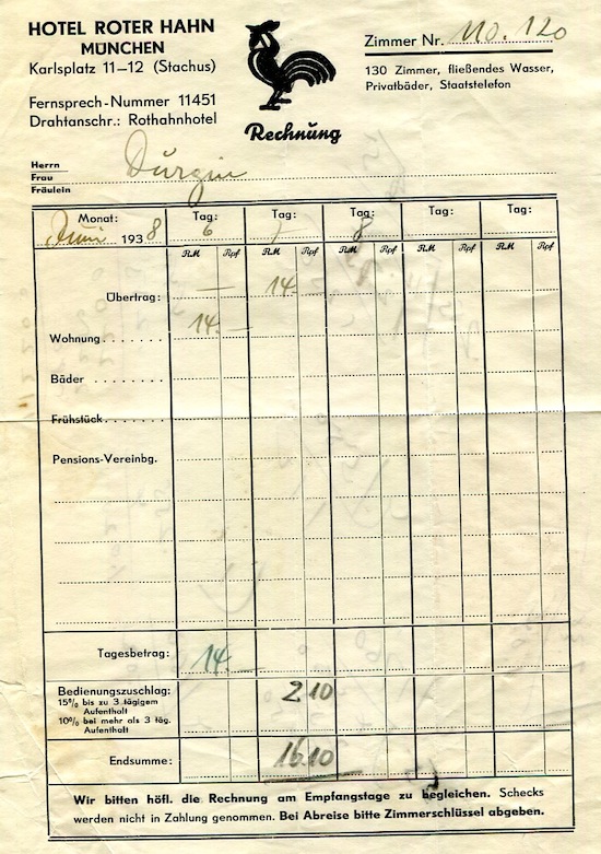 Germany Munich Receipt Hotel Roter Hahn 1938-1