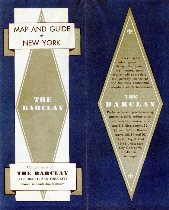USA New York NYC Map Hotel The Barclay 1928