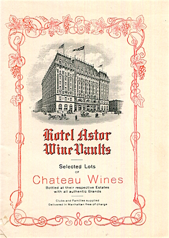 USA New York NYC Wine Menu Hotel Astor 1905 Front