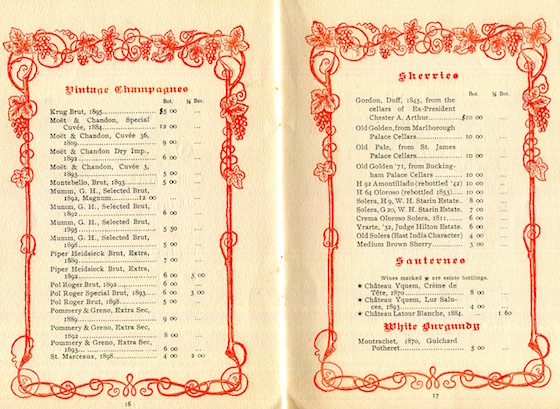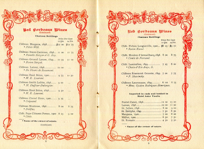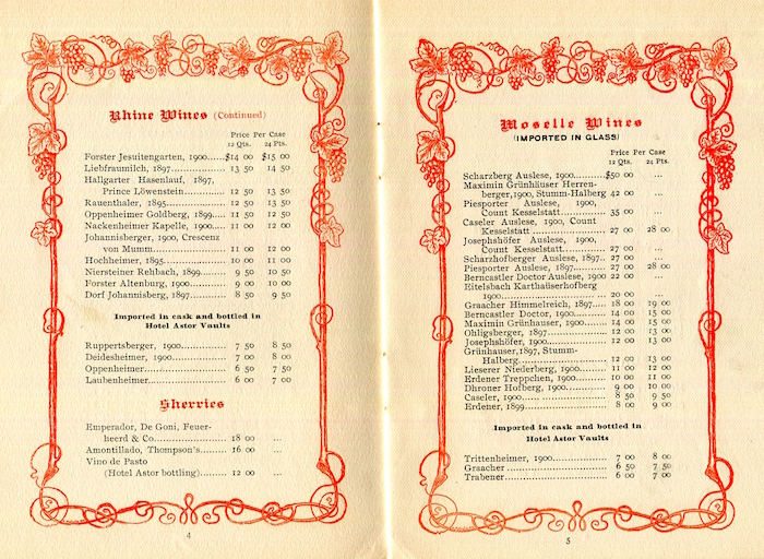 USA New York NYC Wine Menu Hotel Astor 1905 Inside 1