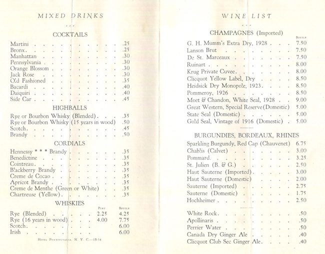 USA New York NYC Wine Menu Hotel Pennsylvania 1934 Inside