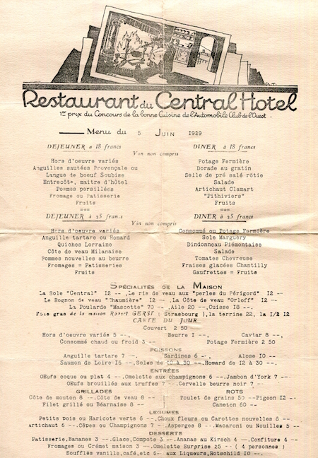 France Nantes Hotel Restaurant Du Central Menu 1929