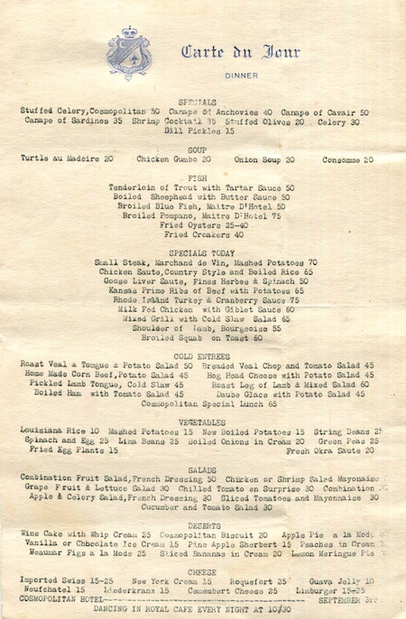 USA Louisiana New Orleans Menu Hotel Cosmopolitan 1910 Front