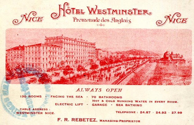 France Nice Hotel Business Card Hotel Westminster 1930