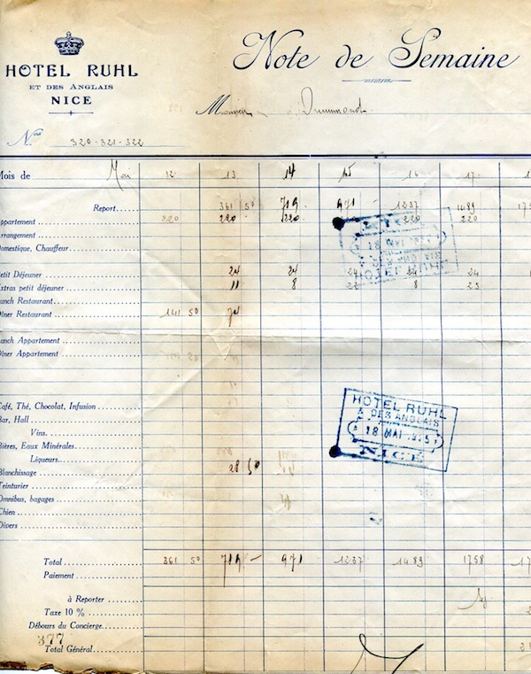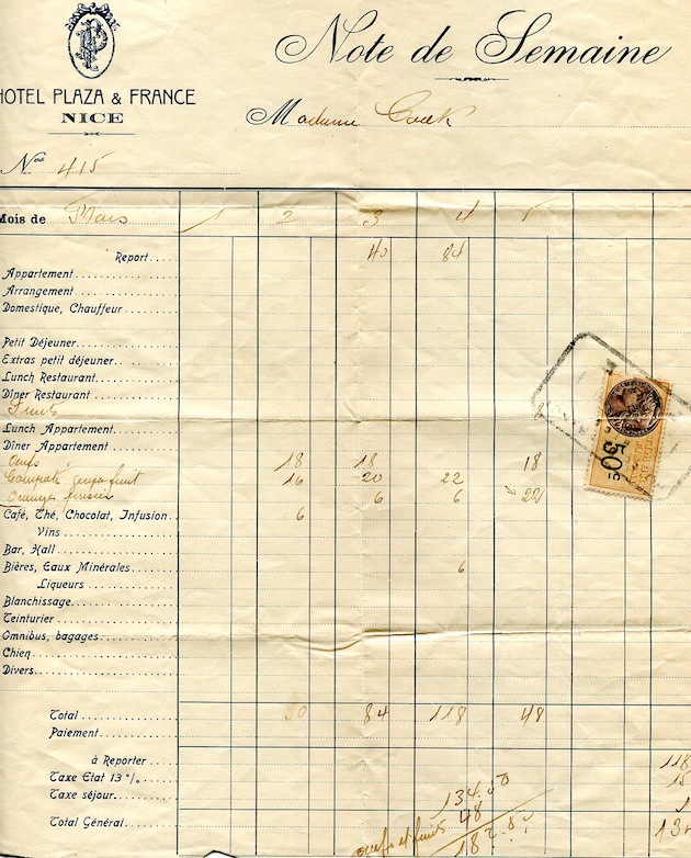 France Nice Hotel Receipt Hotel Plaza & France 1928