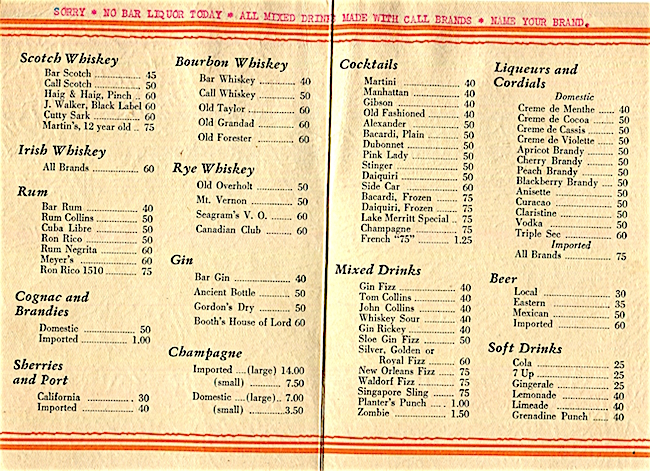 USA California Oakland Lake Merritt Hotel Drink Menu 1944 Inside