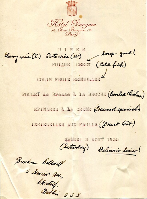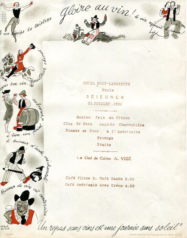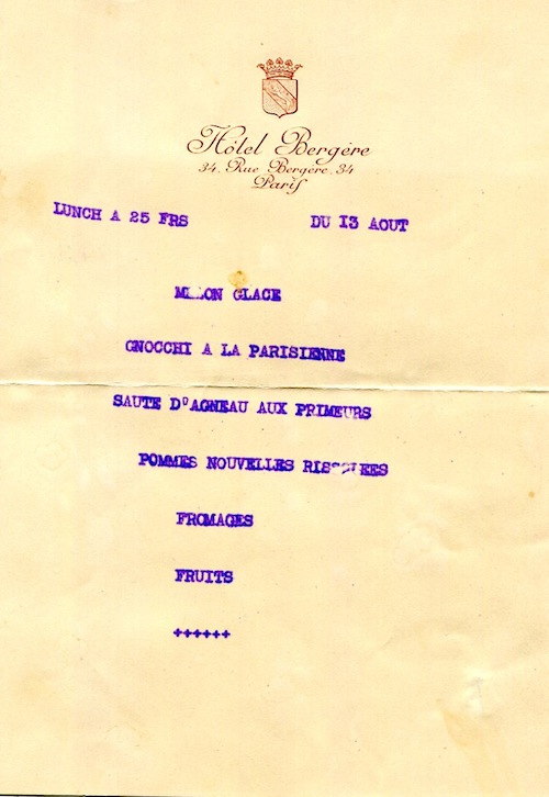 France Paris Menu Hotel Bergére 1934