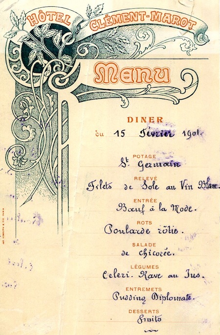 France Paris Menu Hotel Clément-Marot 1901