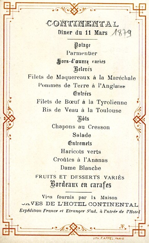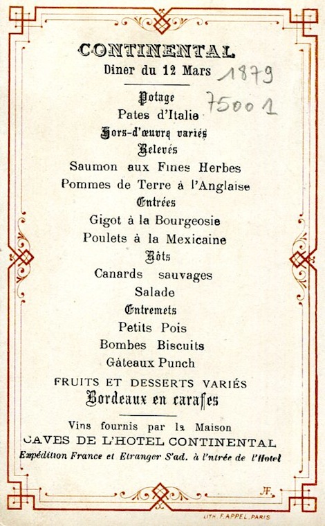 France Paris Menu Hotel Continental 1879-1
