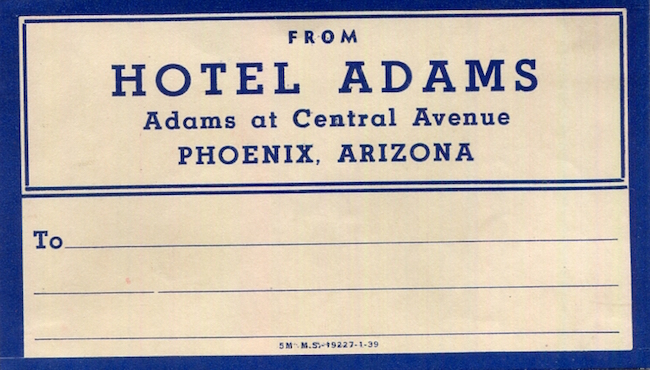 USA Arizona Phoenix Hotel Adams Luggage Label 1939