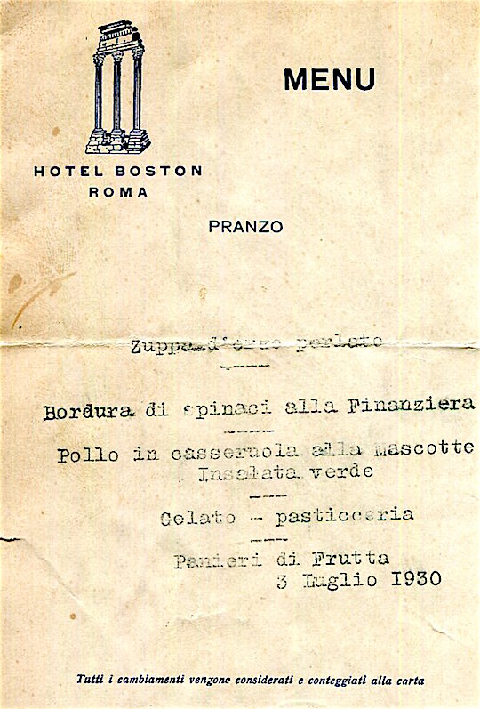 Italy Rome Hotel Boston Menu 1930