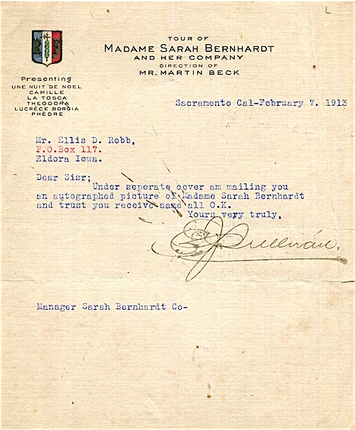 USA California Sacramento Entertainment Tour Of Madame Sarah Bernhardt Letter 1913