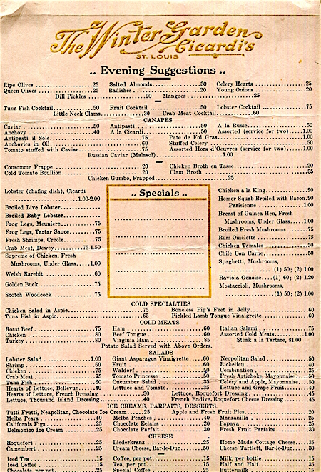 USA Missouri St Louis Menu Restaurant Cicardis Winter Garden 1922