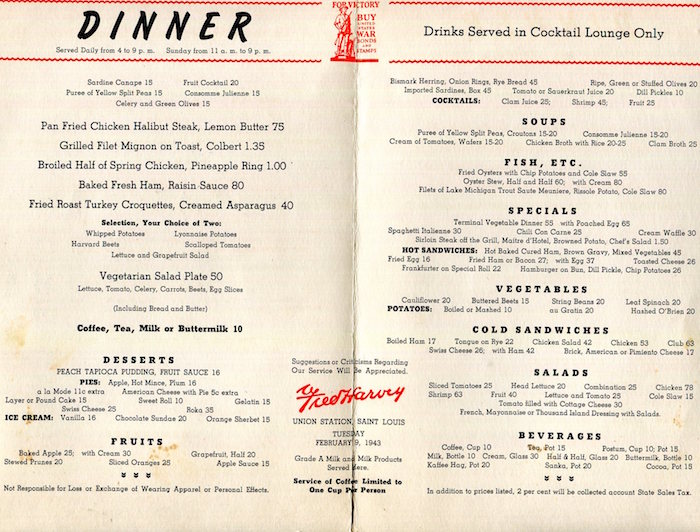 USA Missouri St Louis Menu Restaurant Union Station Fred Harvey 1943 Inside
