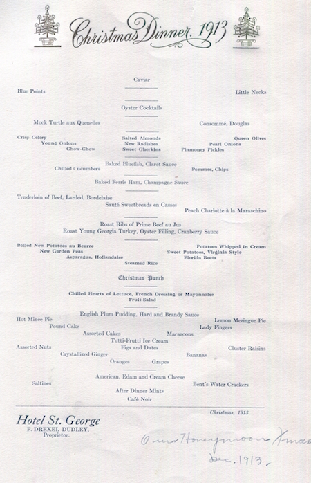 USA Florida St Augustine St George Hotel Menu Christmas Day 1913 Front