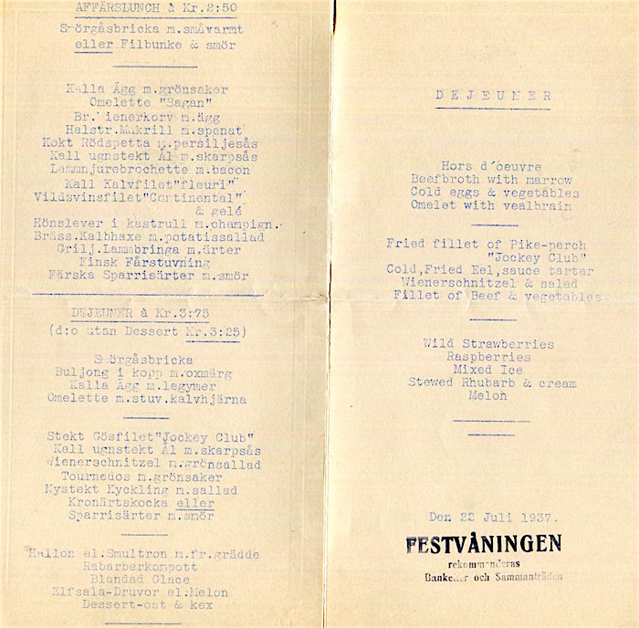 Sweden Stockholm Hotel Continental Menu 1937 Inside