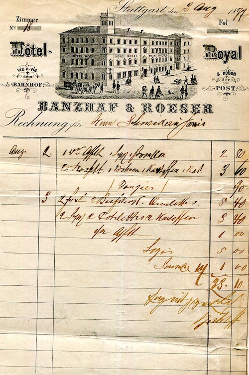 Germany Stuttgart Royal Hotel Receipt 1877