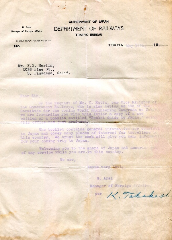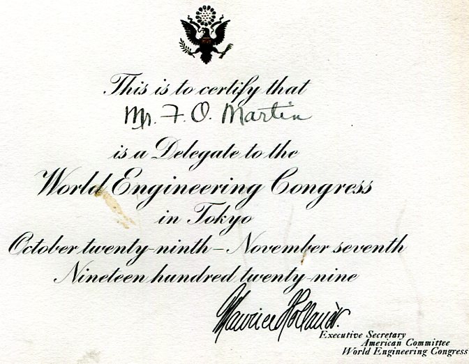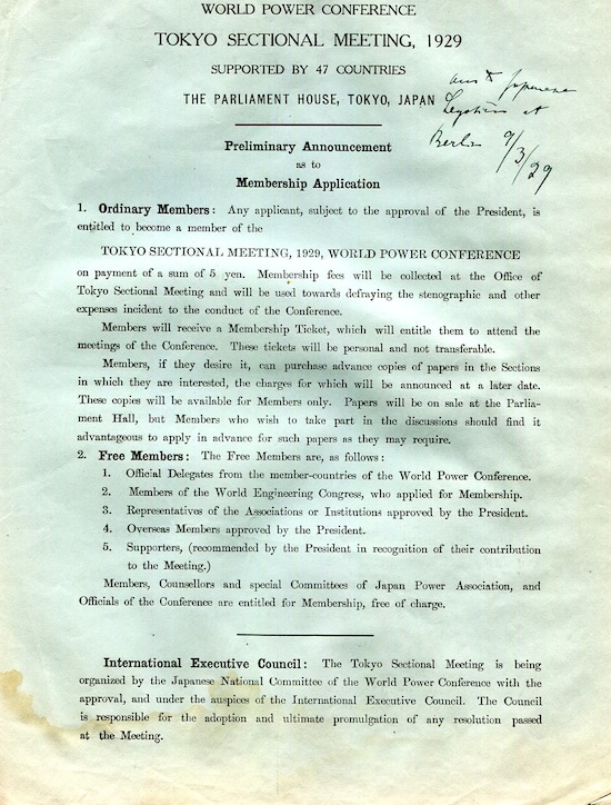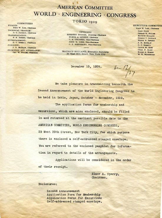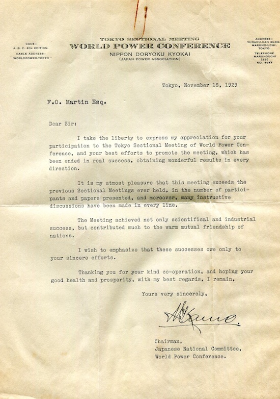 Japan Tokyo World Engineering Conference World Power Conference Letter 1929-1