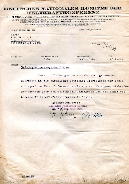 Japan Tokyo World Engineering Conference Letter From German National Committee 1929