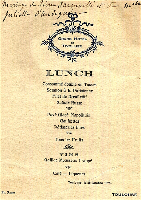 France Toulouse Hotel Grand Et Tivollier Menu 1926