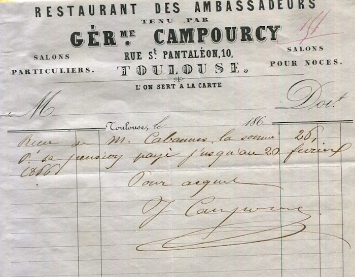 France Toulouse Restaurant Des Ambassadeurs Receipt 1862