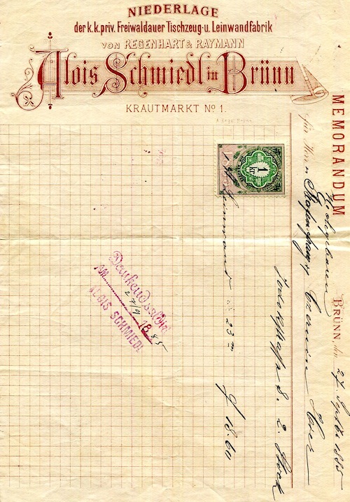 Czechoslovakia Commerce Brno Alois Schmiedl Receipt 1885
