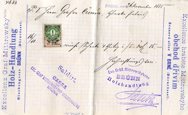 Czechoslovakia Commerce Brno Holz-Handlung Receipt 1885