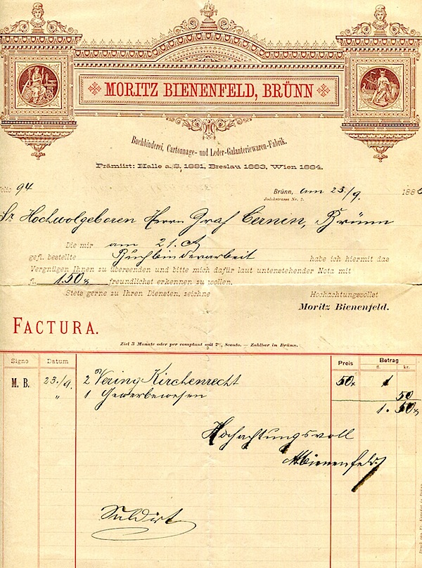 Czechoslovakia Commerce Brno Moritz Bienenfeld Receipt 1885