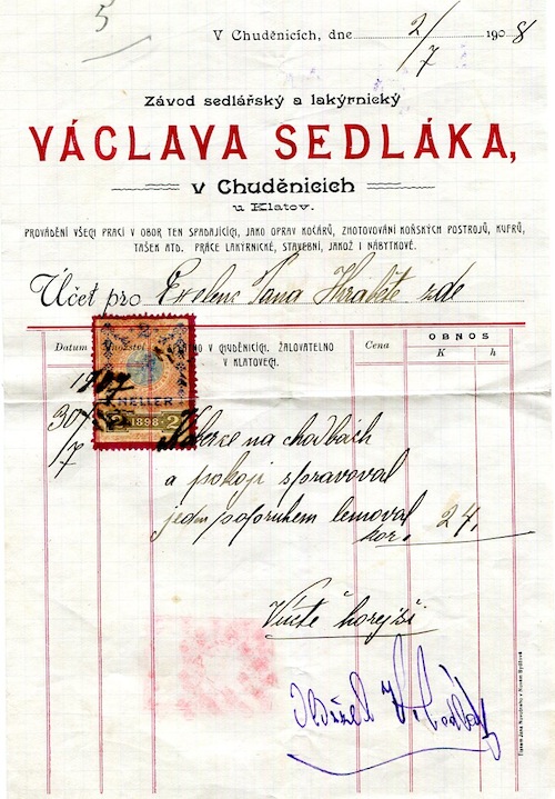 Czechoslovakia Commerce Chudenicich Vaclava Sedlaka Receipt 1908