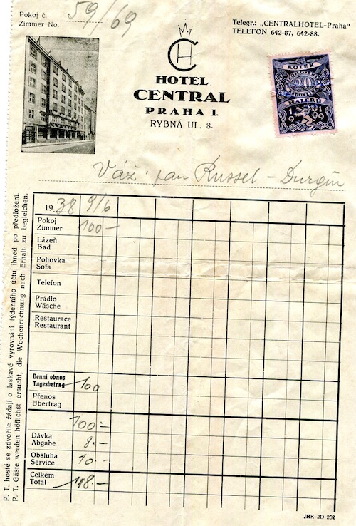 Czechoslovakia Prague Hotel Central Receipt 1938
