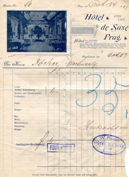 Czechoslovakia Prague Hotel De Saxe Receipt 1907