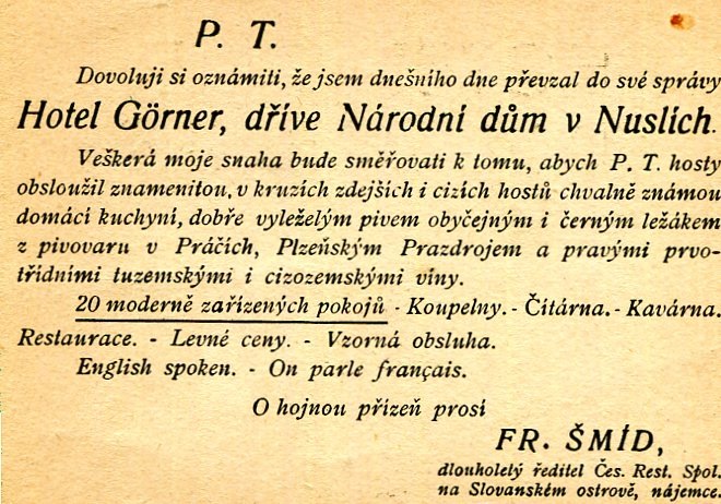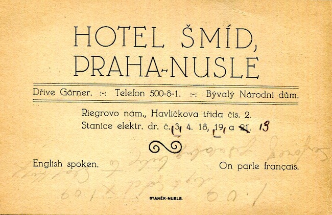 Czechoslovakia Prague Hotel Šmíd Business Card 1924 Side Two