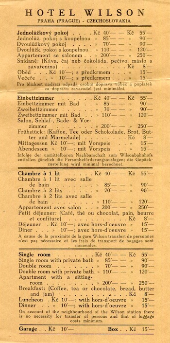 Czechoslovakia Prague Hotel Wilson Leaflet 1920