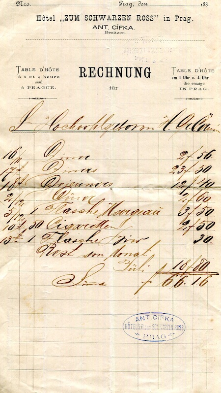 Czechoslovakia Prague Hotel Zum Schwarzen Ross Receipt 1880