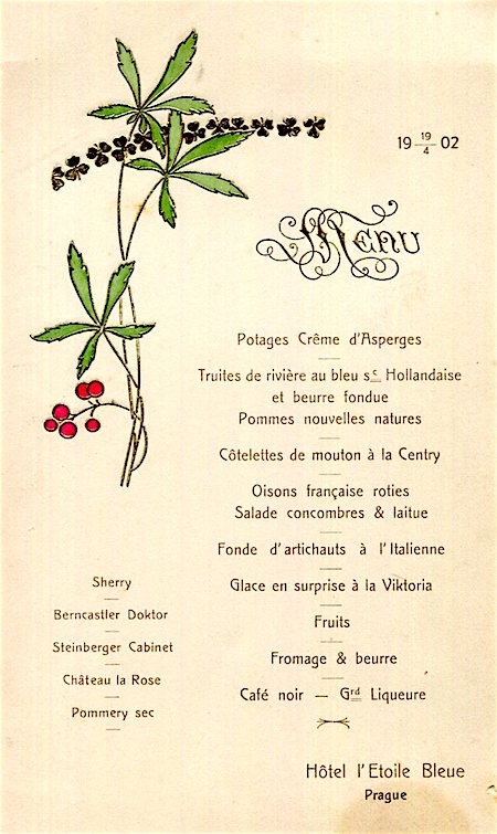 Czechoslovakia Prague Hotel l Etoile Bleue Menu 1902